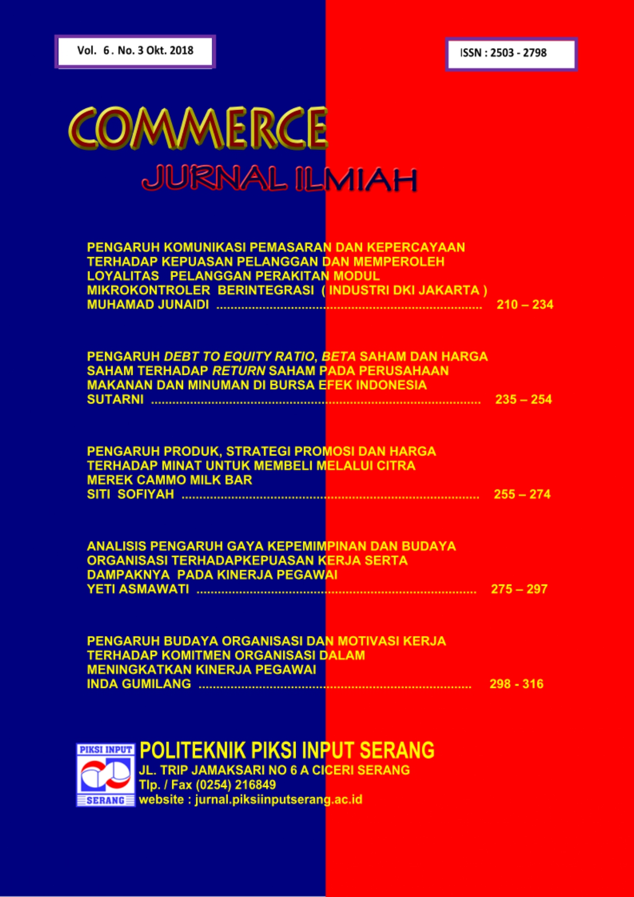 COMMERCE JURNAL ILMIAHi is single blind peer review journal published by Lembaga Penelitian dan Pengabdian kepada masyarakat Politeknik Piksi Input Serang. COMMERCE JURNAL ILMIAH is biannual publication issued in the month of June and December. COMMERCE JURNAL ILMIAH is a scientific journal which prioritizes the publication of articles (research and non-research based) regarding to business and accounting issues that deal with social issues such as management (financial, human resources, marketing), accounting (financial accounting, management accounting, accounting information systems, taxation), economic and others. This is an opened-journal where everyone can submit their articles, as long as they are original, unpublished and not under review for possible publication in other journals